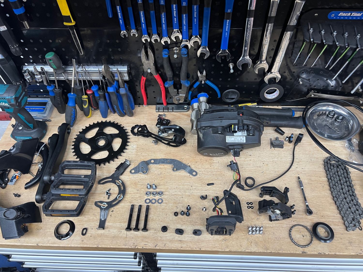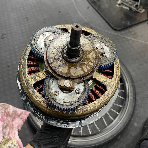 - Hub motors and internal hub gears are opened up and cleaned/lubed.