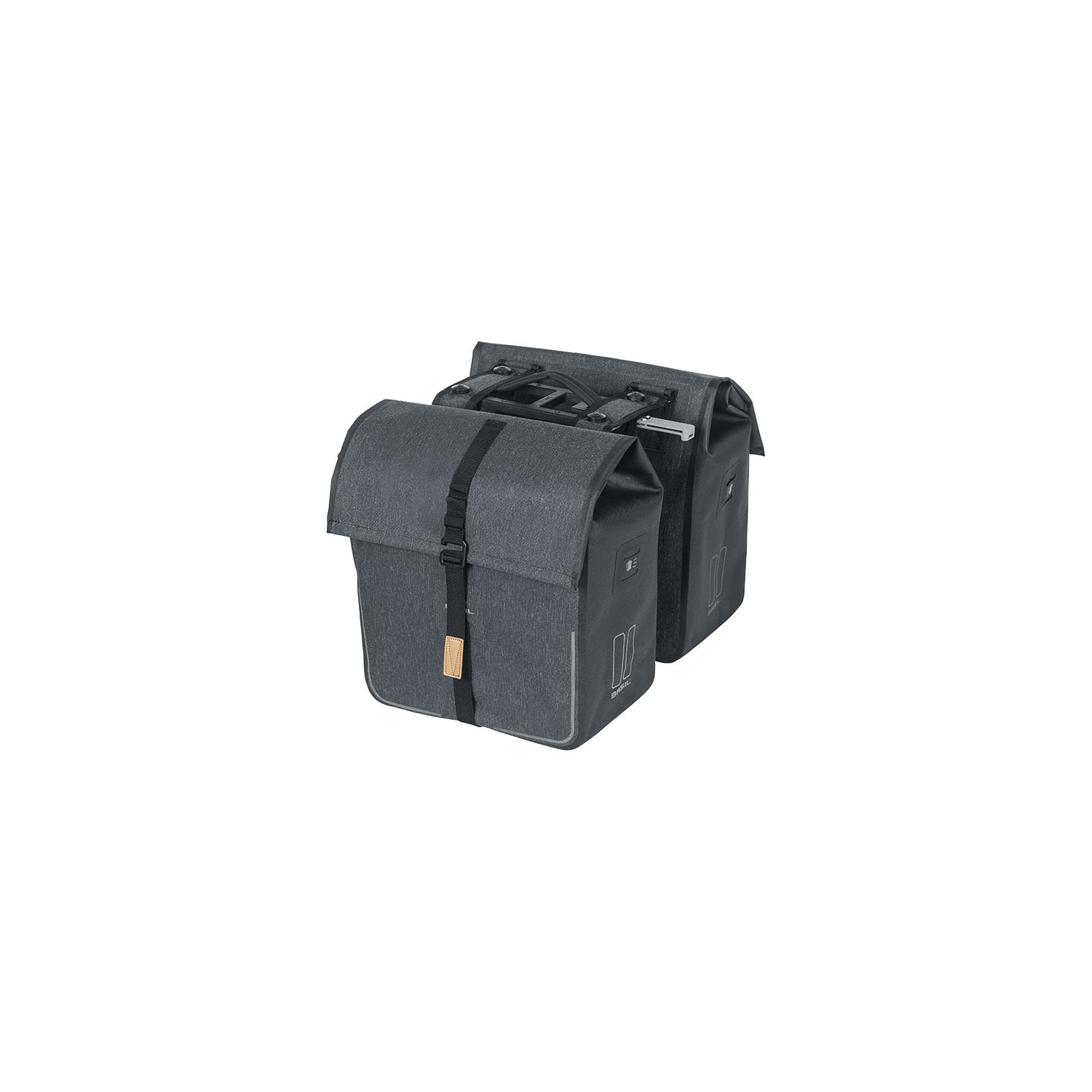 The Basil Urban Dry double MIK pannier, made of polyester, has a luxurious and stylish look and fits on the carrier rack of a men's or women's bicycle. This double pannier is suitable for MIK system carriers and comes with a pre-assembled MIK mounting plate. With a total capacity of 50 litres, you can store a lot of groceries or accessories in it. The Basil Urban Dry is waterproof (IPX 3), has welded seams and a folding closure. The double pannier also offers mounting options for LED lighting: handy when you go out in the dark or when you come home late. The Basil Urban Dry double pannier is equipped with an adjustable closure and thanks to the reflective details you are always clearly visible in the dark. Basil's double bicycle bag is available in charcoal melee.