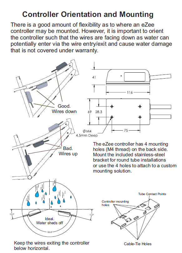 Metal mount that allows connection of the eZee controllor to various places such as round frame tubes. Primarily used for e-bike conversions. The controllor screws to this mount. The mount can be cable tied around tubes.