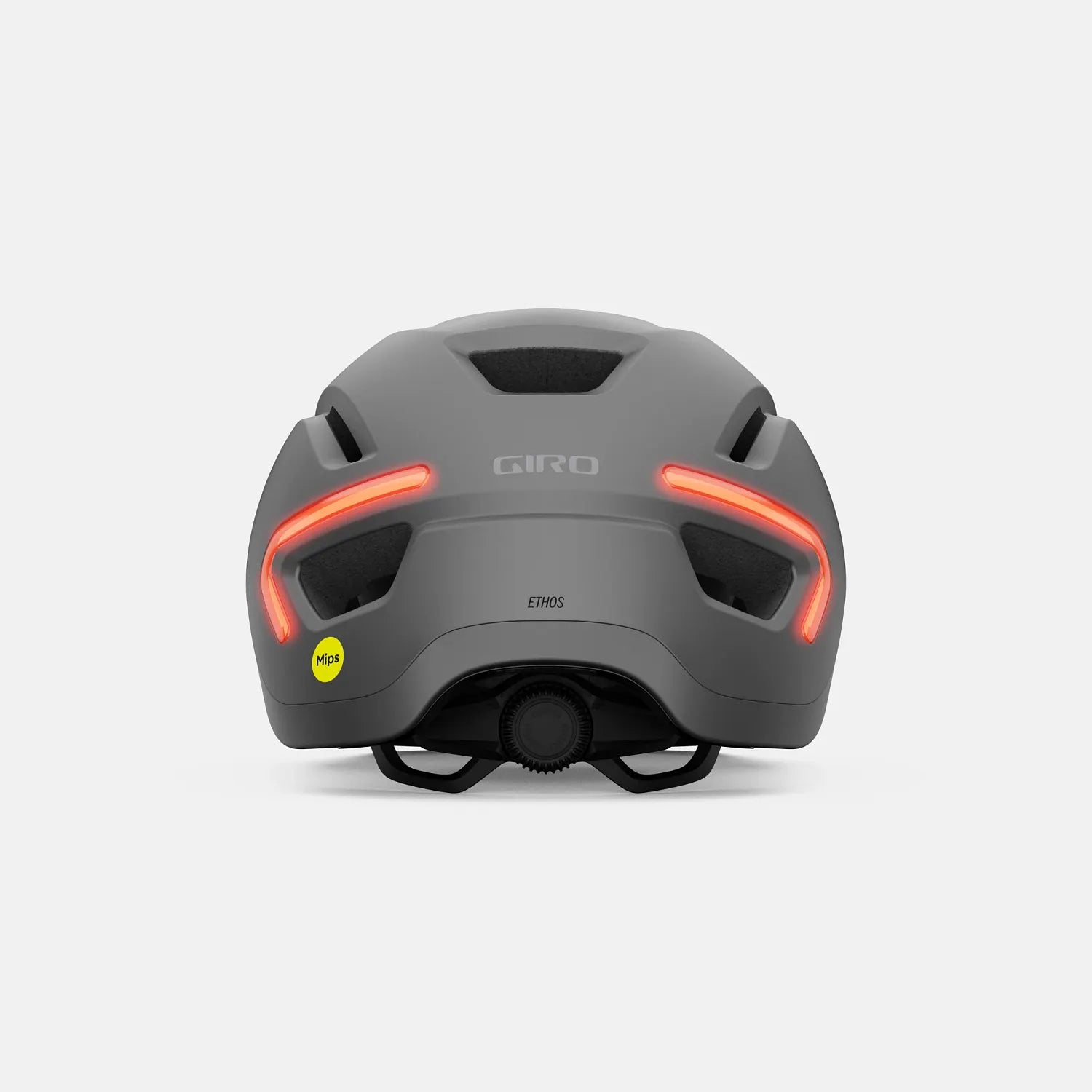 Choose to ride, choose to be seen. The Ethos™ Mips® is a revolution in transportation, with a compact and stylish form featuring the added protection of Mips® Brain Protection System highlighted by integrated LED front white lights, rear red lights, and amber turn signals, all controlled via an intuitive handlebar remote. The entire system is USB-C rechargeable with an estimated run time of 10 hours in low-blink mode and 5 hours in the high-blink mode, which delivers 45 lumens front and 30 lumens rear. Helmet and remote can be fully charged in just 2 hours and 1 hour, respectively. The Ethos Mips features a TPU soft rubber waterproof brim. (The Ethos Mips also is available with a clear, molded eye shield as the Ethos Mips Shield). Despite the added technology, in-mold construction keeps the weight manageable, full hardbody coverage adds durability, and a Roc Loc® City Mips fit system plus quick-dry padding ensure comfort. Whether you're a dedicated bike commuter, running the kids to school on your e-cargo bike, or simply looking for added visibility as you ride around town, the Ethos Mips is a look into the future.