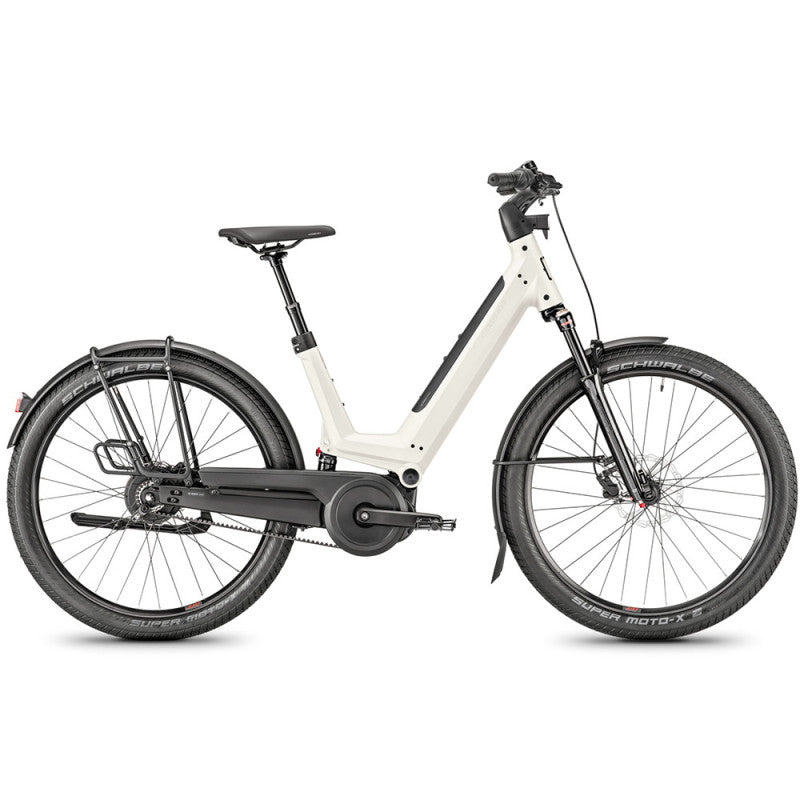 A full suspension yet still step-through electric bike. This bike can do both town and country, thanks to a full range of accessories — the rack, mudguards, kickstand and lights, and also the off-road tyres, suspension front and rear and dropper seat post. The Moustache J uses the Bosch performance line sport motor, giving assistance of 38kph to 45kph, the Bosch smart system with the big screen and a Bosch 625Wh battery. Many people are discovering the benefits of a full suspension bike, especially step-throughs as you have more comfort and also more control. A full suspension bike is not just more comfortable on your body, it sticks to the road better, which means your brakes work better - you're less likely to have a crash when you get onto some loose gravel.