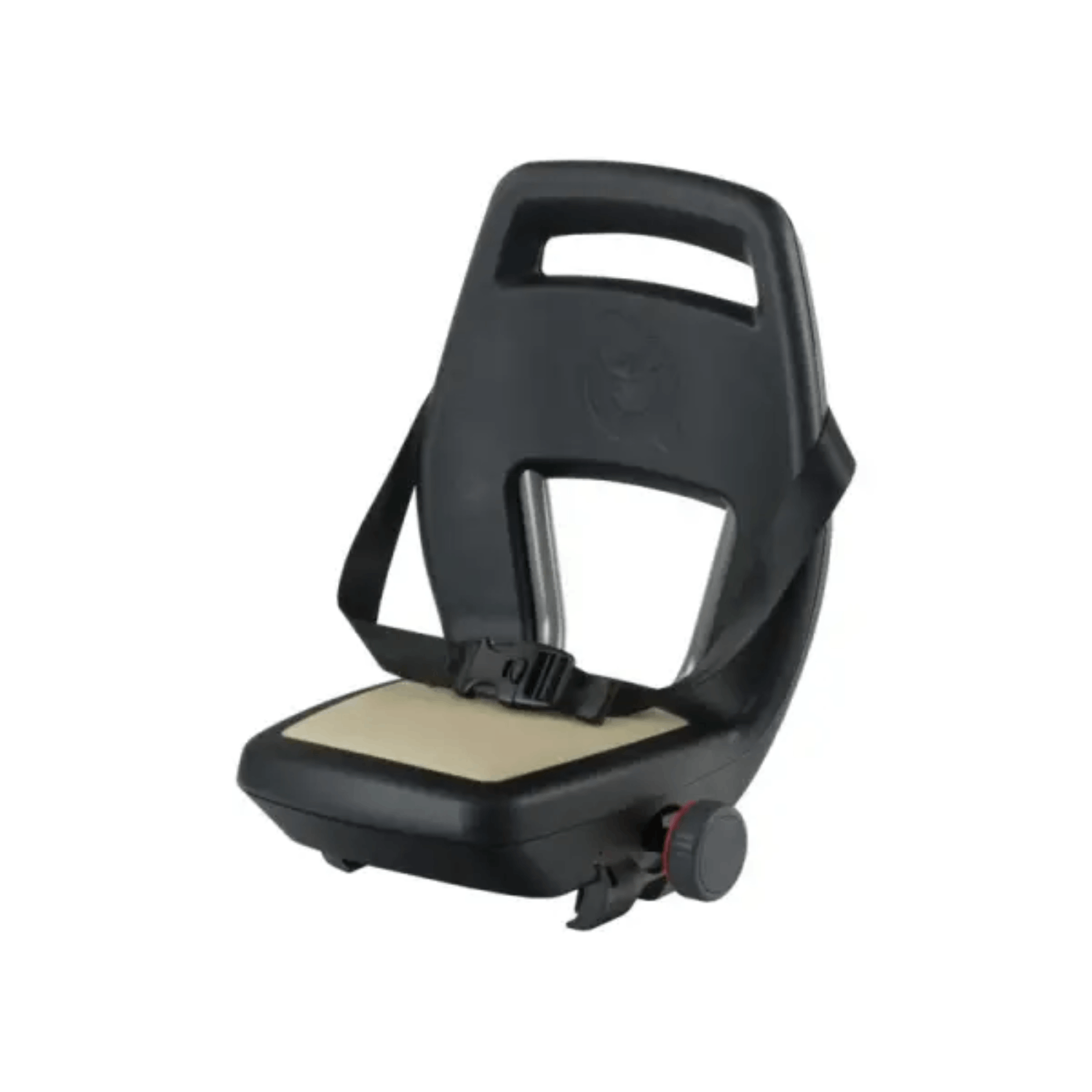 The seat is extra strong thanks to the metal frame and can carry a weight of up to 35 kilos. Safety is always our guiding principle. That's why we fit our seats with a lap belt with a three-point connection and sturdy footrests which you can fit at the desired height. With its soft seat cushion, your child can no longer get out of the bike seat.