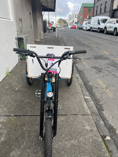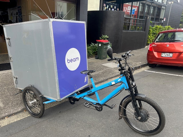 We have refurbished them with new tyres, brake pads and new battery upgraded to 48V. There are two options for the back - the original lightweight parcel box with Beam branding on it, or a (home-made) plywood flat bed style box. Or you can take it with nothing at all on the back. All choices will result in the same overall cost, as we have no use for the Beam box on its own. There are many local signage companies who can quote you on changing the stickers over to your company's branding such as Colourscope in Auckland.
