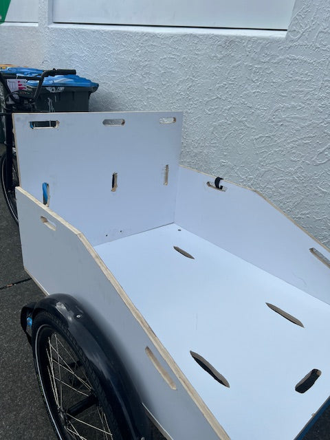 These are well used Radkutsche Musketeer cargo logistic trikes. Originally purchased new by "On a Mission" for parcel delivery, these were then re-sold to Beam, who used them to move scooter batteries around the city centre when doing battery swaps on their scooters and bikes. Beam had a spectacular fall from grace and was subsequently wound down and sold their trikes to us.