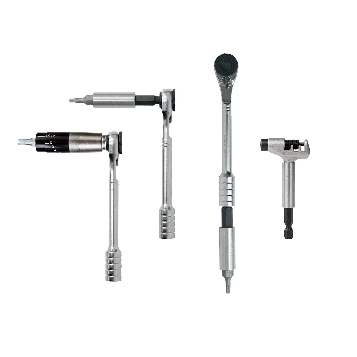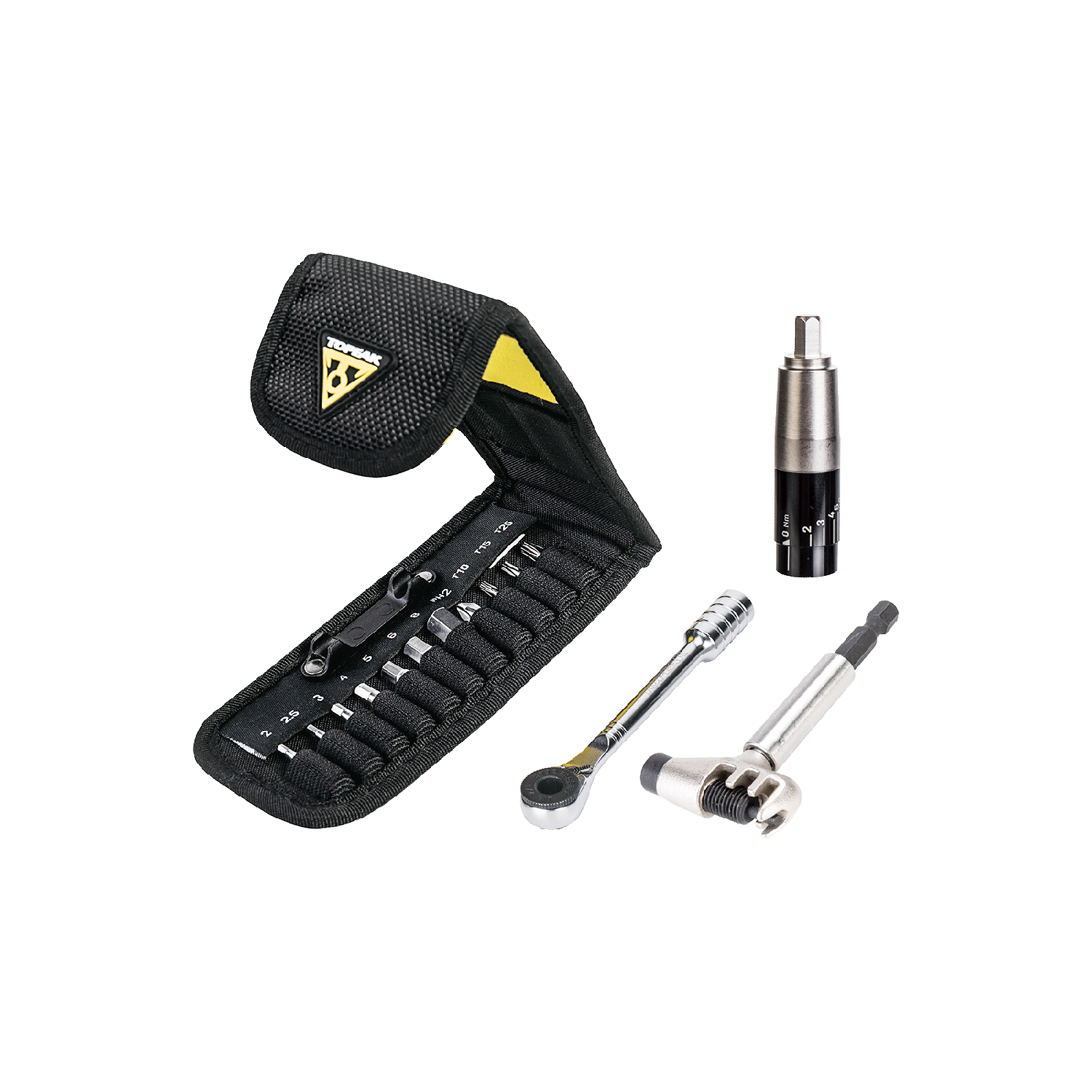 The Topeak Ratchet Rocket Lite NTX+ has everything you need to fix and make precise adjustments to your bike while on the road. Featuring a fine tooth ratchet mechanism with reverse lever and thumb wheel with adjustable torque TorqBit for ease and accuracy in tight spots. Includes magnetic bit holder, hardened steel tools in 2, 2.5, 3, 4, 5, 6 and 8mm hex, T10, T15, T25 Torx®, #2 Phillips bits and CrMo steel chain tool. The protective case keeps things organized and secure, and even has a pocket to carry glueless patches. * The chain tool is compatible with single and multi-speed chains up to 12 speed, NOT including Campagnolo® hollow pin chains.
